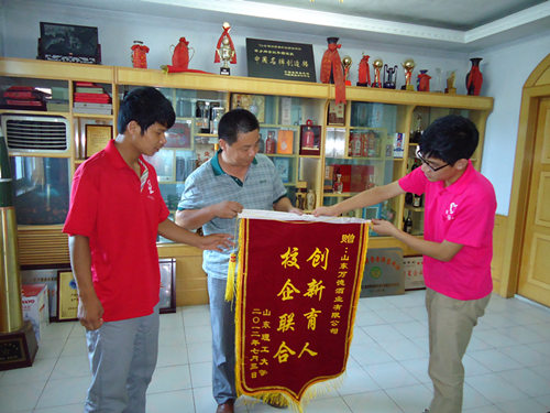 “张经理,我们了解到贵公司在枣酿酒方面取得了一定的成果,能不能给我们简单介绍一下枣酿酒的工艺流程,或者说它与传统的粮食酿酒有什么区别?”、“对于水资源的最大化利用贵公司是怎么实现的?”,同学们就自己感兴趣的问题与张经理进行沟通交流。在实践团队向该公司赠送锦旗后,当天的实践任务宣告圆满完成。
