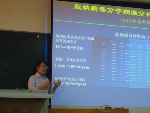 刘红博士的《版纳病毒全基因组序列特征及其分子进化分析》为我们展示了生物信息学在生物学方面举足轻重的地位。版纳病毒是我国科学家于1987年在云南地区从发热和脑炎病人的血清和脑脊液标本中获得。它属于一类新发虫媒病毒,为Seadorna病毒属,在中国、越南、印度尼西亚蚊虫体内均分离出菌株。在我国北京、云南、甘肃、辽宁地区的蚊虫也有获取。对于同学们提出的如何大量抓捕蚊虫,刘红博士向我们介绍了几种方法,一种是在人房用吸蚊器抓捕,另一种则是在麦田和草丛中用诱蚊灯诱捕,这种方法非常实用。根据阳性蚊虫种类,版纳病毒主要存在于库蚊、按蚊、伊蚊中,而这几种蚊虫广泛存在于世界各地,意味着版纳病毒具有潜在全球传染性。它的结构特征十分鲜明,长度为21kb,各节段非常紧凑,冗余序列少,各结构均为单顺反子结构。针对版纳病毒基因分型研究可以分为两类,一种是A型,进一步分为A1亚型,主要为我国北方菌株分离所得,A2亚型主要为我国南方菌株分离所得。另一类则为B型。不同地域基因分型存在差异,不同宿主中寄生的版纳病毒也存在差异,具有宿主特异性。那么版纳病毒又是如何进化而来?在自然界中又如何生存,刘红博士应用生物信息学为我们重构了版纳病毒的进化树,从其分子溯源分析具体分为碱基替换模型、版纳病毒种群进化动力、选择压力分析、种群TMRCA、种群进化动态几个方面进行阐述。