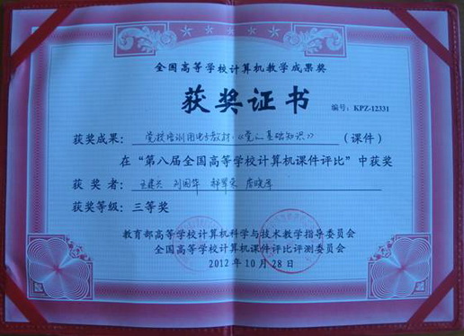2012年10月27-28日,第八届全国高等公司计算机课件评比大会在长沙召开。本次大会由教育部高等公司计算机科学与技术教学指导委员会、全国高等公司计算机课件评比评测委员会、全国高等公司计算机教育研究会、中国计算机学会教育专业委员会、《计算机教育》杂志社主办,中南大学承办,旨在进一步推动我国高等公司计算机课件的开发、使用和交流,提高高等公司教学质量。全国150余所高校的优秀课件参赛,有60件作品经过初赛后入围决赛,公司组织部、党校提交的《党校培训用电子教材:党的基本知识》课件参加了决赛。根据大会规程,决赛中每一课件要经过现场演示和评委现场评分两个环节,党校办公室主任郝翠荣、生命科学公司党总支副书记王建兴代表课件开发团队在大会现场进行了课件演示和讲解,在规定的10分钟内从课件特点、创新点等方面进行了阐述,最终获得大赛三等奖。