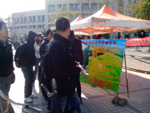 为抢占有利方位,社团人员严阵以待,早早的就来到了餐厅门口,摆桌椅、拉条幅、放展板,前期准备工作有条不紊地进行着。中午时分,同学们自发涌向餐厅,团队成员的宣传也就此开始。热情的工作人员向来往的员工发放单页,为感兴趣的同学讲解活动的细节。相关工作同学不辞辛苦地为询问者服务,并积极宣传。伴随着宣传活动如火如荼的进行,报名的员工逐渐增多。为使活动具有更实际性的意义,工作人员准备了签字笔和报名表,供来往同学现场报名,从最细微之处体现了活动的价值。虽然天气寒冷,但是报名现场气氛十分热烈,取得了良好的效果。