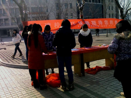 为使活动引人注目,社团人员早早来到餐厅门口,占据有利方位,严阵以待、摆桌椅、拉条幅、放展板,前期准备工作有条不紊的进行。中午,同学们涌到餐厅,宣传从此开始。热情的工作人员向来往的员工发放单,为感兴趣的同学讲解活动的细节。相关同学也不辞辛苦为咨询者讲解,并积极宣传。活动如火如荼的进行,报名的同学也越来越多,因此,工作人员准备了签字笔和报名表,供来往同学现场报名,这里从最细微之处体现了活动的价值。虽然天气寒冷,但报名现场气氛十分热烈,取得了良好的效果。