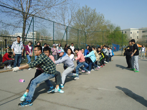 比赛开始,每支队伍的候补人员都自发地组成啦啦队,为参赛人员加油助威。四个比赛场地,每个场地呐喊声、欢呼声此起彼伏。生命科学公司抽签决定对战商公司,当比赛双方进入指定场地,在各自规定位置蓄势以待时,工作人员核对人数之后,伴随裁判一声哨响,第一局比拼开始了。两边参赛队员一齐用力,男生个个都涨得面红耳赤,竭尽全力向后拉;女生也巾帼不让须眉,放下平时的淑女风范,使劲攥紧绳子,用尽全力,一阵僵持之后,第一局以商公司获胜结束。双方交换场地,准备就绪,在第二局,生命科学公司的啦啦队队员竭力呐喊:“一二,一二,加油,加油······”虽说第一局成绩不理想,但他们并没放弃,仍然竭尽所能,尽自己最大的努力去扳回局势,虽然最后没能进入下一轮比赛,但从他们憋得通红的脸上我们看到了他们的努力。
