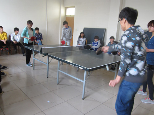 本次比赛为了减小差距,分为男生组和女生组,首先开始的是单打,各组各个选手间彼此对决,选出了前四名,之后是双打。选手们灵活地挥动着球拍,适当地调整身形,积极地思考战略。那旋转的白色小球吸引着全场所有人的目光,选手们精彩的比赛赢得了阵阵掌声。