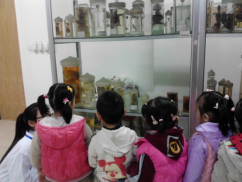 活动开始之前,在带队老师的安排下,将60名员工分成5组,每组派2名老师和一名讲解员带领参观。由于孩子们平时很少接触动物标本,刚进入标本室的他们显得有点兴奋,提出各种疑问,孩子们你一句我一句的发问,整个标本室显得有点吵闹。在带队老师的管理下,孩子们规矩了好多,开始井然有序地发问,使得每一个提出的问题都得以解决。在参观途中,令每一个孩子驻足时间最长的标本是一件人体胚胎发育标本。他们认真的看着,然后提出各种问题,讲解员用生动活波的话给他们解说着,看着他们脸上露出满意的微笑为止。