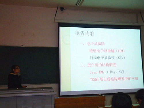 而后,刘翠翠博士进行了题为“蛋白质的电子显微学研究进展”的演讲。报告伊始,刘翠翠博士先带领我们了解了投射电子显微镜、扫射电子显微镜两种显微学的特点以及发展历史,充分调动了同学们的兴趣,随后又为同学们讲解了蛋白质的结构研究以及公司的研究发展现状、现有仪器设备和研究规划。