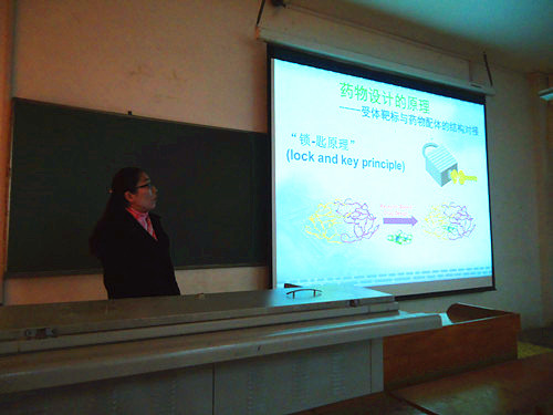 首先,纪洪芳教授以“小分子在蛋白世界中分布规律对药物设计启示”为主题做了相关的学术报告。纪洪芳老师以“小分子在蛋白世界中的分布有何规律?”、“天然产物为何更易发展为药物?”、“如何克服现代药物研发面临的困境?”三个问题展开阐述。纪洪芳教授为我们讲述了现今的药物研发所面对的问题,使我们正确认识和了解了药物研发的现状以及发展前景。之后,纪教授介绍了药物设计原理以及相应的药物设计的预计发展规划。