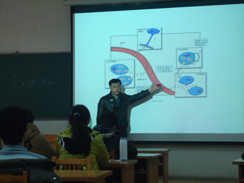 报告会伊始,赵博生教授讲述了内分泌调节及激素是如何调节细胞的,引起了同学们很大的兴趣。随即,他向听众们介绍了2012年诺贝尔化学奖,该奖项获得者研究清楚了激素的受体—蛋白偶联受体。赵教授着重从文昌鱼的GpHR表达,讲述了动物内分泌调节的起源与进化。期间,同学们积极地向老师提问问题,充分表现了求知若渴的心情。