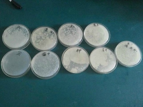 经过实验研究调查,淄河中游水质较差,河水呈现黄色,且有较多杂质,PH值严重超标,达到9.44,而生活在其中的细菌呈线状,少数呈单个分布,或许正是这种高碱性水样的缘故,其菌落较为单一,并没有像其他水样呈现不同菌落。其他水质PH值在7--8之间,相对较好,菌落生长状况各不相同,例如孝妇河上游,部分菌落连成片状,个别单一分布,有些菌落相对较小,表面光滑,部分菌落内部可再生出其他菌落,至少三种菌落。而东猪龙河中游菌落较厚,部分连成片状。
