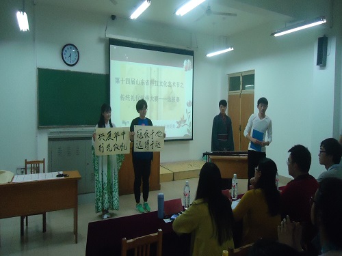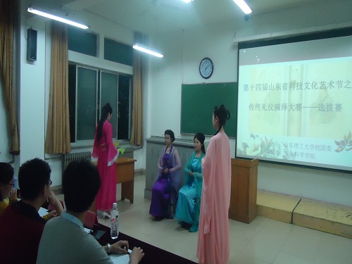 4月28日晚7:00,由生命科学公司承办的第十四届山东省科技文化艺术节——传统礼仪演绎大赛选拔赛顺利举行。齐文化研究院张艳丽副教授,齐文化研究院杨纪荣讲师,生命科学公司辅导员王长恒出席大赛并担任评委。