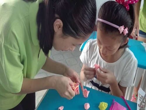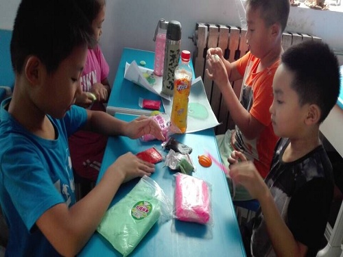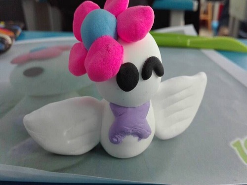 下午的课程主要是教同学们用彩泥制作工艺品,实践团陶艺授课小组的队员们先是以小组为单位向同学们分发彩泥材料,邢志强向同学们做了简单的讲解后,同学们便投入到认真的制作过程中去。一块块五颜六色的彩泥在同学们的手中像被施了魔法般,被捏成各种不同的模样:愤怒的小鸟、大白、小天使、五彩的点心……孩子们的想象力不同,做出的作品也不尽相同,但每一个都包含着同学们的用心。更有同学拿出作品送给陶艺授课小组的老师们。