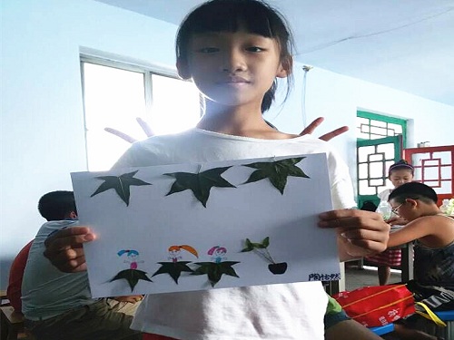 此次活动主要是对11日压制的植物标本进行装订。在支教队员的详细解说下,小朋友们便拿起彩笔开始在卡纸上绘制自己喜欢的图案,然后用胶水将压制的标本黏贴在卡纸的相应位置。小朋友们一个个埋着头,手中的画笔与标本交相呼应,一个个形象生动的图案跃然纸上:父亲母亲牵着孩子的手走向远方、有蓝色的天空彩虹高挂、五彩的火箭奔向太空...
