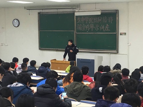 两位警官一幽默风趣的语言就目前广泛存在的且易受骗的多种互联网诈骗形式向同学们做了宣传普及,包括手机短信诈骗、QQ诈骗、支付宝诈骗、微信诈骗等。他表示,互联网信息量大,垃圾信息多,利用互联网作案隐蔽性强,并且抓住受骗者贪小便宜的心理,犯罪成功率比较高。警员向同学们讲述了几个发生在近期的真实的诈骗案例,在宣讲过程中警员更是提醒各位同学不仅要注意在网上注意被骗,现实中更要保护好自己,同时在现场向同学们展示了一些非法人员的盗取财务手段,提醒同学们加强防范意识。