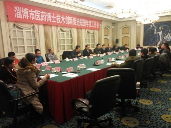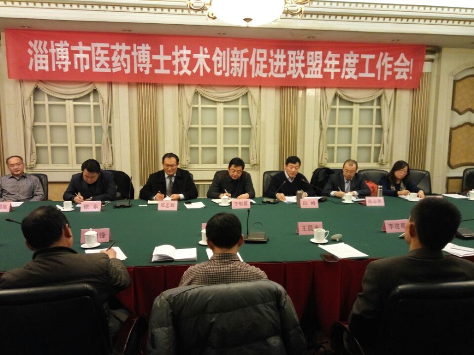 2016年1月22日淄博市医药博士技术创新促进联盟(简称博士联盟)年度工作会在淄博饭店举行,公司经理陈志伟博士带领生物技术系主任邓洪宽博士、生物工程系主任卢明锋博士、实验室主任盛桂华博士、重点实验室申报秘书刘红博士、药物化学组骨干教师孙娟博士参加。会议由陈志伟教授主持。