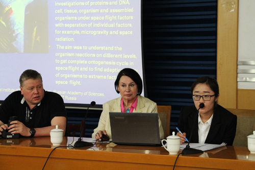 在报告中,加林娜向在座师生介绍了俄罗斯空间生命科学研究发展概况;展示了俄罗斯在空间育种应用到的技术和仪器设备;展示了在太空中生长的植物,并介绍了在太空中进行的一系列植物生理生化实验。公司师生认真聆听报告,仔细记录,结合自身知识,理解报告内容。