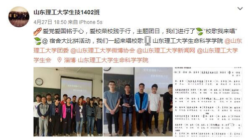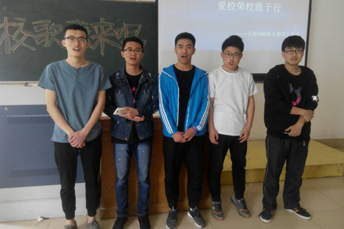 举办“校歌我来唱”比赛。主要以宿舍为单位,由一带多,男带女的组队形式,进行校歌合唱比赛。并当场互评。比赛结束后大家情绪高昂,饱含热情,抛却了比赛结果共同进行校歌大合唱。