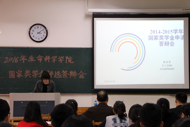 答辩开始,翟静涛上台,向大家介绍了国家奖学金的申请资格以及评选的规则。随后王建兴也给同学们普及了在答辩过程中可能会出现的专业名词,方便同学能能够更好地理解竞选者答辩中的内容。准备就绪后,三位竞选者依次上台,结合PPT进行演讲,介绍自己在校三年时间里取得的成绩。优秀的学习成绩、丰硕的科研成果、出彩的获奖情况、丰富的社会实践经历引起了台下同学们的阵阵惊叹。同时,评委们也对竞选者答辩中的细节问题提出了自己的疑问。竞选者也认真地回答了评委提出的问题,同时把自己的优点和过人之处展现给了大家。