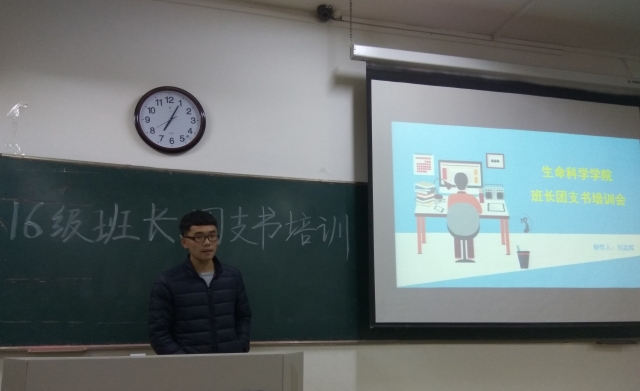 会议开始,作为生技1501班长的刘孟辉首先论述了班长、团支书、员工干部这三者的联系与区别。围绕“我的班级我做主”这一主题分别展开三个部分,同学定位、班长定位以及班委定位。他提出的班委是各班级的精神领袖、力量源泉这一点唤醒了16级的班长、团支书责任意识。随即刘孟辉又具体讲述了班级学风建设方面细化内容,包括强化考勤制度、小组化学习、警惕不良风气、形成共同的班级目标等等,对16级各团支部的班级建设提出可行性建议。