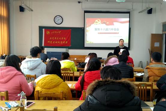 公司特别邀请了马克思主义公司研究生时政宣讲团带领全体入党积极分子学习十八届六中全会会议内容、精神。宣讲团从十八届六中全会提出的十二个关键词等方面着手讲解,从全面从严治党、党内监督到反对腐败、选人用人,结合《永远在路上》的视频与现实案例,宣讲团讲述清晰,参会人员学习认真,培训学习效果较好。