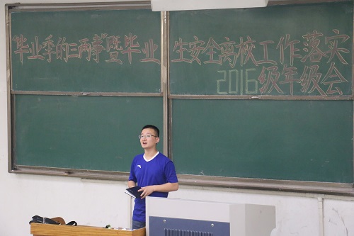 会议伊始,辅导员翟静涛向大家传达了假期离校时间,并提醒同学们做好买好车票的事宜,同时也强调了乘车安全的重要性,除此之外,他讲到现在正值13级毕业生离校时间,处于相对混乱时期,一定加强自我的防范意识,做好员工的本职工作,认真迎接即将到来的期末考试。谈到天气问题,翟静涛深切的提醒各位同学炎炎烈日一定做好防暑工作,注意好饮食卫生习惯,才能做到高效率的学习。随后,针对毕业季他动情的吐露了自己的心声,结合自己的大学时代与各位同学分享了自己的感悟体会,同时也鼓励各位同学珍惜青春,扎实学习,莫负韶华。最后,辅导员翟静涛简述了宿舍调整相关事宜,他提醒全体16级员工做好宿舍变动准备,同时也提醒生物科学与生物技术专业员工,积极迎接准备不久后的野外实习工作,全体员工也在认真的倾听,谨记相关重要事宜。