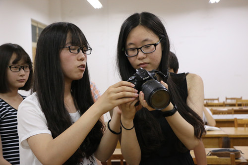 随后,张守萍讲解摄影中的构图部分,她提到,构图的基本原则是突出主体,揭示主题思想;要从主题思想出发,正确处理好主体、陪体与环境的关系。她以图片为例讲解构图及拍照模式的应用,连拍模式适用于高速运动的人物或物体如运动会等,同时,她提醒大家在拍照时切记拍摄角度、画幅安排、画面结构中心等构图影响因素。为了使同学们更加清楚相机的结构,她鼓励同学们尝试使用相机,了解相机上按键及标志的含义。