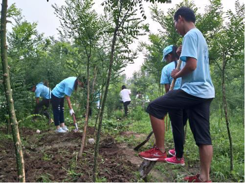 凌晨四点半,天色渐明,实践队员伴着晨起的露水,开始了一天的劳作。队员们手拿铁锨、锄头等农具,摩拳擦掌,在太阳村爱心林里进行翻地松土。沉重的铁锨无法压抑众人帮助太阳村孩子的热情,即使多日来的干燥与高温已让这片土地硬如磐石,但各队员思及太阳村孩子的境况,毅然开始执行任务。