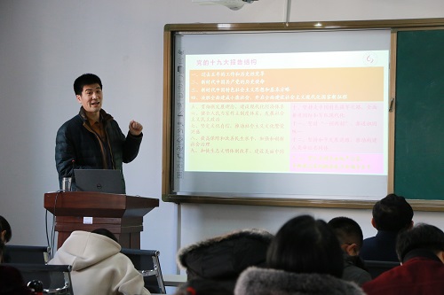 陈靖首先对党的十九大重要性进行介绍,说明学习贯彻十九大重要讲话精神是必要且迫切的。随后,他对大会主要内容进行了细致分析,使大家对十九大报告的整体结构和报告重点有清晰认识,他认为,《报告》是对国家发展的“定位、定标、定向、定法”。同时对十九大会议中的“新时代”、“我国社会主要矛盾变化”、“习近平新时代中国特色社会主义思想”、“中国共产党人的历史使命”等关键词进行了重点解读。最后他说到作为中国共产党人,更应该勇担时代赋予的历史使命,为党的伟大梦想而奋斗。