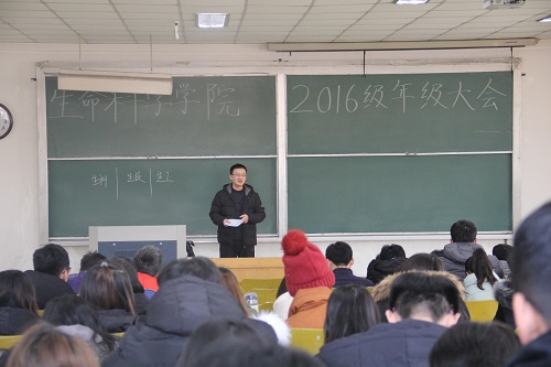 12月26、27日,生命科学公司组织召开期末年级大会,对期末考试及元旦放假等事宜做集中安排部署,2016,2017年级全体同学参加会议,辅导员老师翟静涛主持进行。