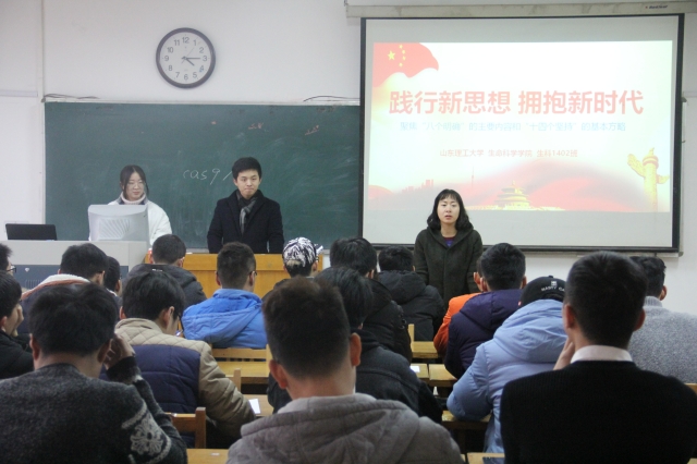 会议尹始,李兰晶针对此次活动的意义做了具体指导,针对当代老员工如何践行习近平新时代中国特色社会主义思想做了具体阐述。随后,生科1402班同学从“新时代、新指南、新战略、新作为”四个方面深刻解读了十九大报告精神,并通过观看《不忘初心继续前进》记录片,同学们直观感受到了十八大以来的五年,党领导中国人民在经济社会全面发展的所做的生动实践和取得的巨大成就。