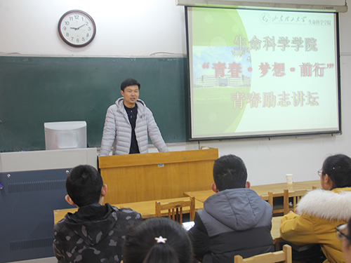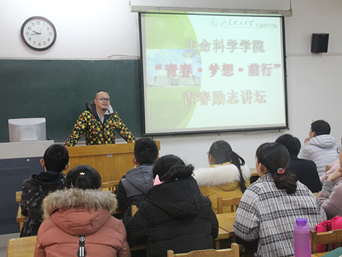 3月18日,生命科学公司“青春·梦想·前行”青春励志讲坛于13号教学楼218室正式揭开序幕。公司“青春在线”网站原站长2004级李燕和2008级陶新乐作为首期主讲嘉宾应邀开讲。公司党总支书记郭万保出席活动现场。辅导员翟静涛,2017级制药工程实验班及“冯思广班”—生科1702班全体同学参与此次活动。