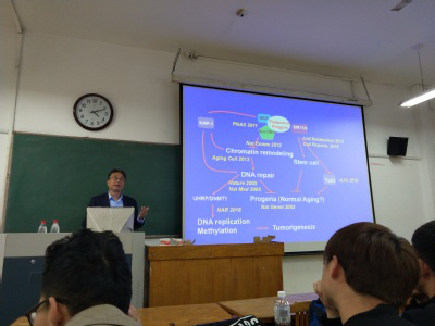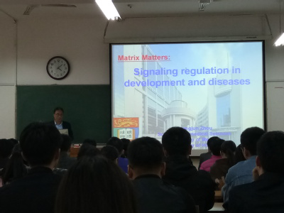 周教授主要从事衰老和胞外信号转导方面的研究,他首先简要介绍了在小鼠sirt6衰老模型中P53被激活促进了小鼠的衰老。随后主要讲解了多年来其课题组对基质金属蛋白酶MT1-MMP(MMP14)在胚胎发育、骨骼形成、血管生成、神经系统及淋巴管的形成中发挥的作用,以及在这几个方面MT1-MMP与其相互作用蛋白及其信号通路的研究。最后周教授表示他们团队将继续对MMP14的新功能和P53在抑癌方面的作用进行深度研究。