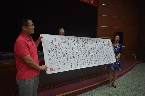 报告结束时,张福信向全体2018级新生赠送了他亲笔书写的书法作品——毛泽东同志的词《沁园春•长沙》,并引导在场员工齐声背诵,借以勉励“风华正茂”的“同学少年”珍惜大学时光,勤奋学习,刻苦专研,练就“到中流击水”的本领。