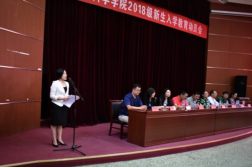 党总支副书记陆广峰主持入学教育动员会。刘文教授作为教师代表进行发言。她和同学们分享了“远方”“大学自助餐”“幸福生活能力”“批判性思维”等4个关键词,希望大家在大学里能够不断拓宽视野,积极追求自己的大学营养餐,主动训练自我意识和批判性思维,努力成长为德智体美全面发展的社会主义建设者和接班人。