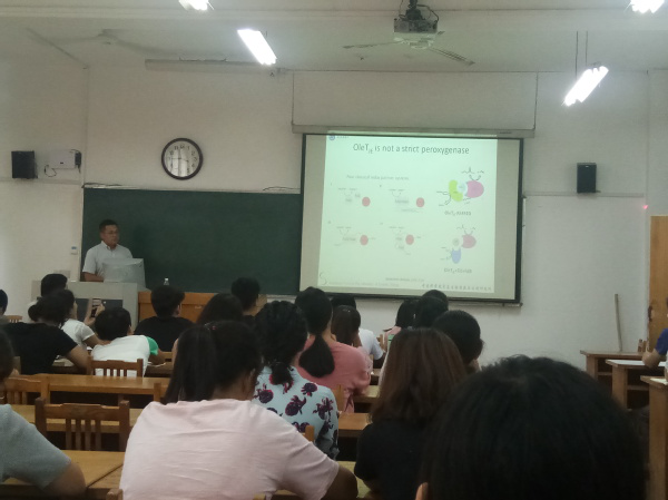 9月14日下午,生命科学公司在13号教学楼215室举行学术讲座。国家优青、山东省杰青,中国科公司青岛生物能源与过程研究所博士生导师李盛英研究员来公司进行学术访问并作“细胞色素P450酶—重要的合成生物学催化原件”学术报告。生命科学公司多名教师、研究生及部分本科生参加,公司副经理巴连良主持本次学术报告会。巴经理对李盛英研究员做了简要介绍,并代表公司师生对李盛英研究员的到来表示热烈欢迎。