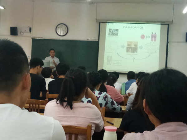 李盛英研究员主要进行生物合成P450单加氧酶方面的研究,这次的报告,他首先简要介绍了细胞色素P450酶在合成生物学的作用。随后主要讲解了细胞色素P450酶在药物代谢、天然药物的生物合成、污染物的降解以及生物燃料等方面的应用。接着,他通过三个小故事来像大家展示了目前细胞色素P450酶的最新研究进展及其在免疫抑制剂、生物能源、环境保护等方面的重要作用。最后李研究员表示他们团队将继续对细胞色素P450酶在合成生物学上的作用进行深度研究。