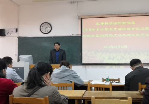 10月16日下午,生命科学公司党总支在13号教学楼218教室,举行2018年下半年党支部培训开班式暨与周村区招商局支部共建专题党课。公司党委组织部副部长李涛出席开班仪式,周村区招商局机关党支部书记陈慧仑及部分党员代表、生命科学公司全体党员参加此次专题党课,党总支副书记陆广峰主持。