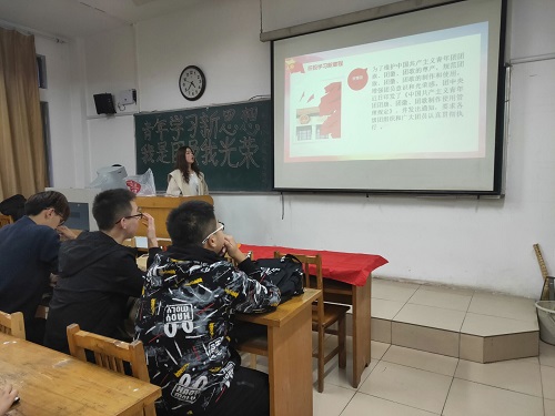 此次主题团日活动包括通过PPt宣讲团旗、团徽、团歌的使用等有关知识,对所讲内容开展知识竞赛、唱团歌、宣誓以及团支部全体成员写下关于此次活动的感悟三个环节。