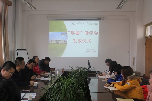 12月27日下午,生命科学公司在13号教学楼248教室举行“厚德”助学金发放仪式。智和兴医药科技有限公司总经理杨全军、生命科学公司党总支书记郭万保、党总支副书记陆广峰、员工工作办公室主任李兰晶、辅导员翟静涛、李超和受资助的8名经济困难员工参加。