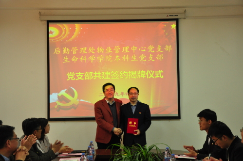 4月17日上午,生命科学公司本科生党支部与后勤管理处物业管理中心党支部在13号教学楼248室举行支部共建签约仪式。公司党委常委、副董事长查玉喜,后勤管理处、生命科学公司相关领导以及两支部成员代表参加会议,物业管理中心主任苏学群主持。