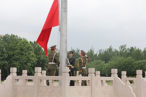 升国旗现场,伴随一声响亮的“出旗!”,国旗班成员护卫着鲜红的国旗,迈着铿锵有力的步伐走向旗台,动作整齐划一,气氛庄严肃穆。在庄严的国歌声中,五星红旗迎着清晨的微风冉冉升起,全体人员怀以热切激动的心情向国旗行注目礼。