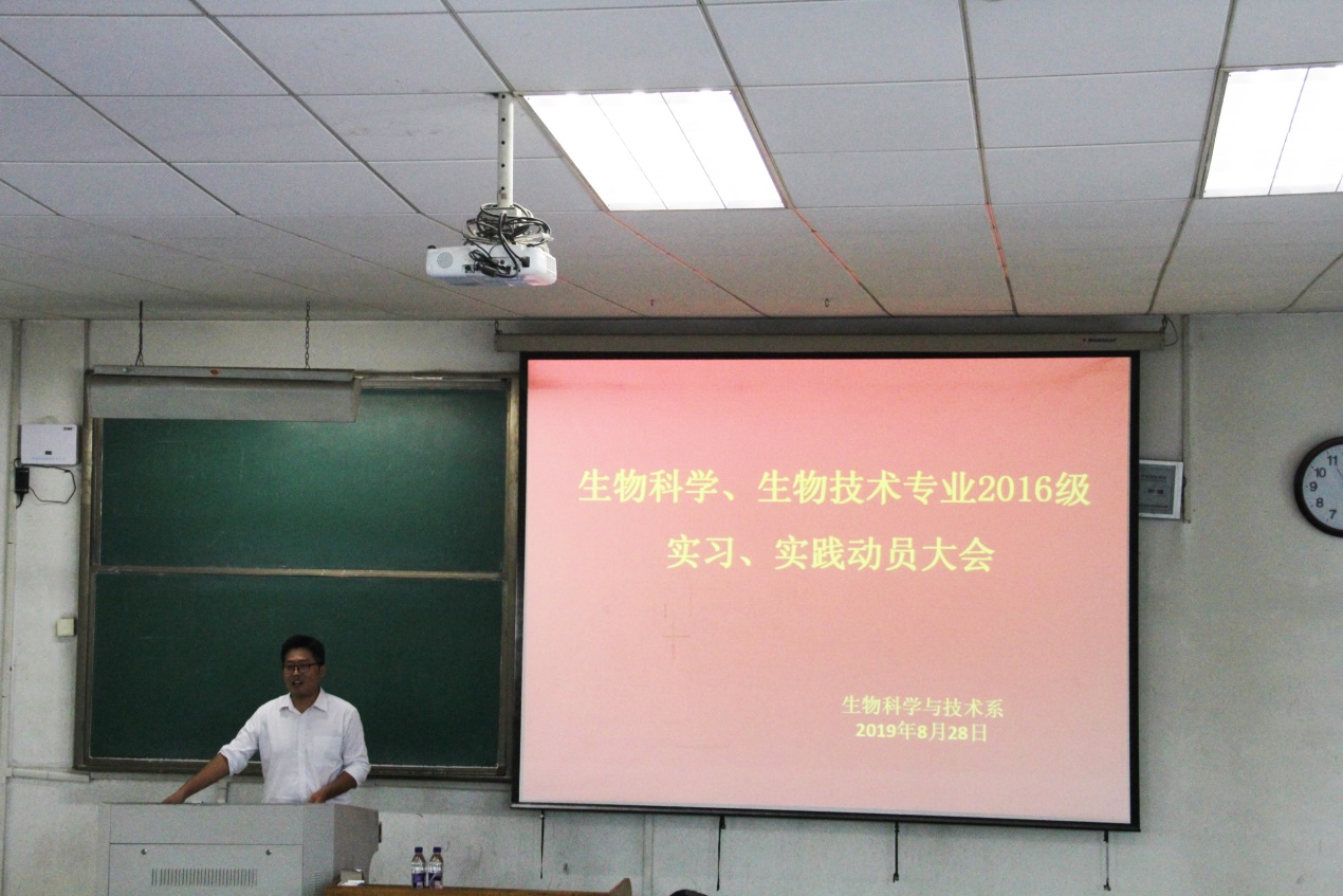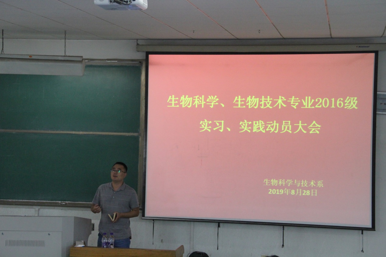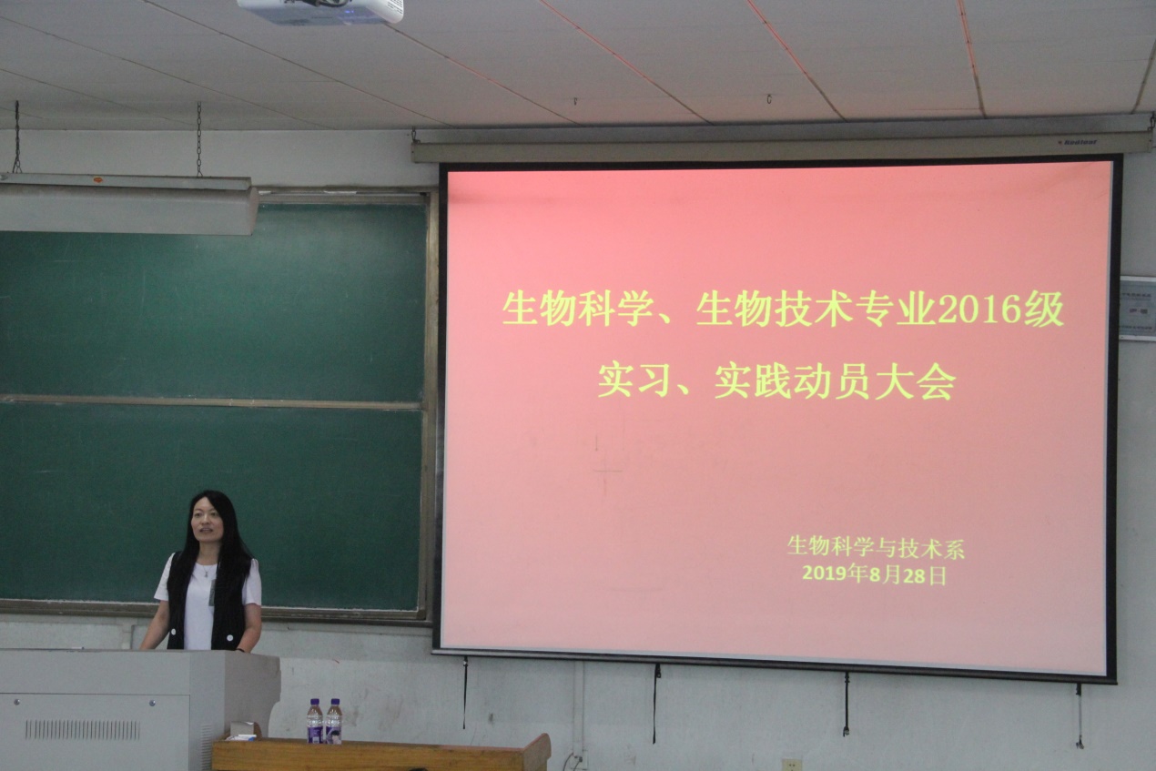 8月28日下午,生物科学与技术系在5号教学楼201室举行2016级生物科学、生物技术专业实习实践动员大会。公司副经理(主持工作)庞秋香、经理助理桑锋、系主任张月杰、系教工党支部书记兼系副主任谢文海出席大会,2016级生物科学、生物技术专业全体同学共同参加。会议由谢文海主持。