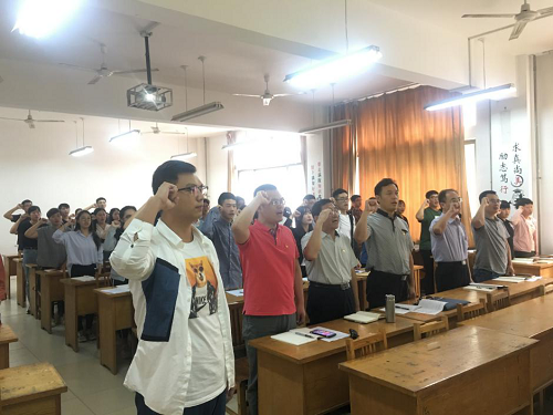首先,在本科生党支部党员刘中乾同志带领下,全体党员面对党旗高举右拳,重温入党誓词,重温入党之初的决心和信念。
