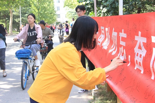 千余名同学们表情严肃,接连在签名横幅上写下了自己的名字,表达自己牢记历史、热爱祖国、勇敢肩负起振兴中华民族重任的坚强决心。