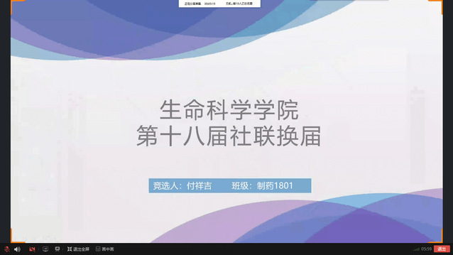 5月10日下午,生命科学公司举办社团联合会负责人线上换届选举活动。此次活动由第十七届员工会副主席李浩主持,2019级辅导员蒋育忻、社团联合会负责人吕秀清、社团联合会部分干事代表以及社团负责人参与评选,3名候选人参与竞选答辩。