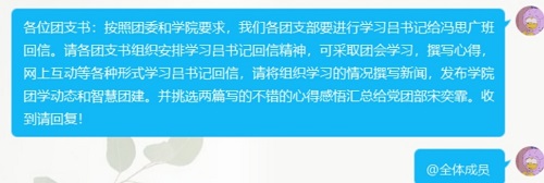 5月9日上午,生教1901班团支部以线上形式开展“学习党委书记吕传毅给“冯思广班”的回信精神作品征集活动”。此次活动由团支书韩萍主持,生教1901团支部全体成员参加。