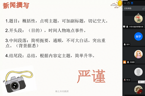 会议伊始,衣雨潇阐明此次社会实践的活动目的和安排,并对核电站、环保局、村镇河流等实践地进行详细介绍。她鼓励成员们积极主动地投入到实践中去,锻炼自己的能力,增长搏击风浪的真实本领。接着,团队成员张宇进行安全和礼仪培训工作,他向大家分享了一些必备的安全技能小知识,包括疫情当下我们如何做好自我防护、如何保障自己和他人的安全等方面。便后续实践工作的进展,张宇带领大家学习一些简单的当地方言。最后,团队成员李永航展开微信和新闻培训工作,他围绕新闻稿撰写、新闻投稿、微信制作和发送几个方面进行详细讲述和说明,并强调新闻撰写的严谨性和真实性,要做到思路清晰、言语精干。会议进行的如火如荼,成员们也就此次社会实践发表了各自的观点和想法。