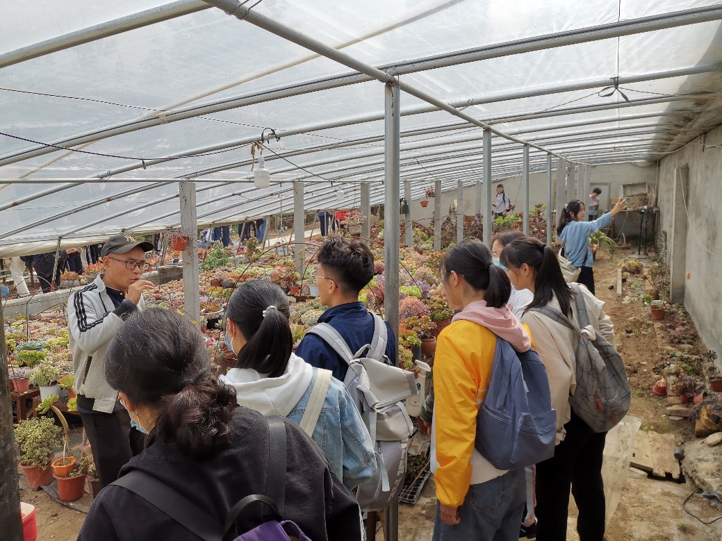 实习团队还来到当地网红打卡地“老刘多肉园”参观多肉植物,并由多肉种植户刘国峰为同学们讲解多肉种类和培育技术。