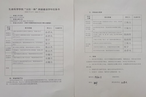 随后辅导员就学习问题与大家积极探讨解决方法。提出制定奖惩措施以提高同学们的学习积极性,组织全体同学自行分析成绩进步或退步的原因,及时发现总结问题,做到查漏补缺,希望同学能利用好网络平台上的学习资源使用网络在课下进行自主学习,各班可以组成学习小组共同学习,共同进步。辅导员与各班班级委员签署《生命科学公司“五位一体”班级建设学年任务书》,任务书中确定了班级本学年具体工作目标。包括‘制定班级自律公约’·‘举行班级文化活动’·‘创建班级网络平台’·‘构建班级成长氛围’。各班班级委员签署任务书并保证完成公司任务,创建好班级‘五位一体’建设。