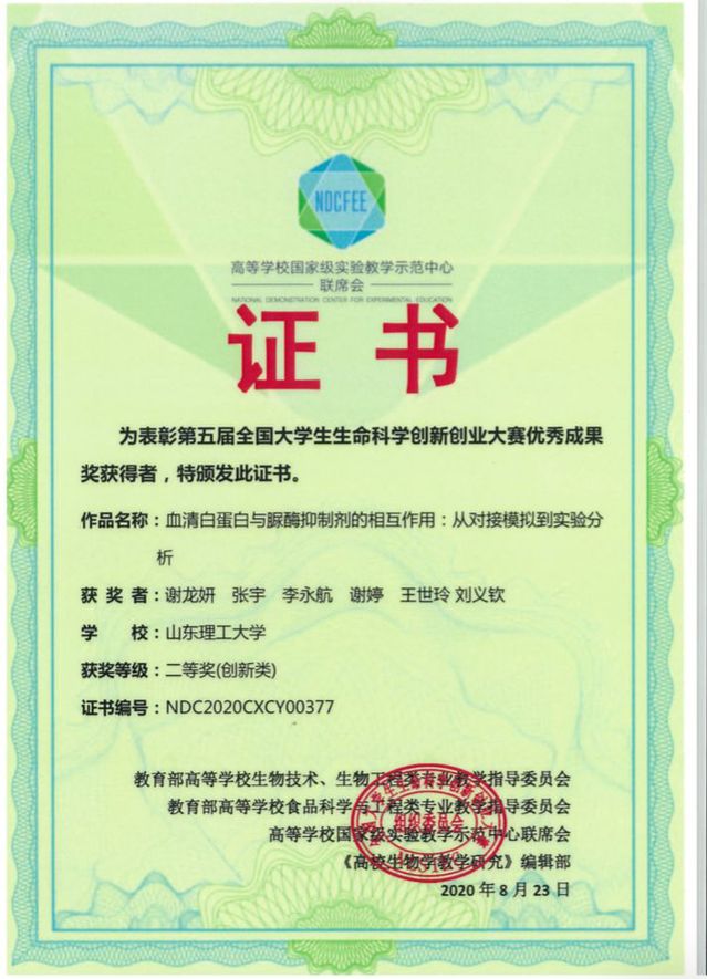 日在第五届全国生命科学创新创业大赛中获得国家级奖项二等奖。