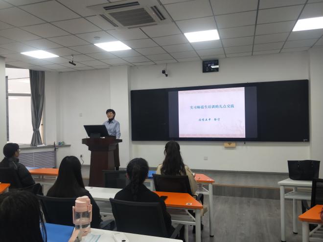 3月11日,徐宁老师从自身中员工物教学的经历出发,以与同学们深度交流的方式,与同学们分享了成为一名优秀的中员工物教师应具备的品质和素养。同时,向同学们详细介绍了淄博市中学教学“三课型,五环节”的内容和要求,以及教师在各个教学环节中所起的作用。此外,还从教师着装礼仪、实习心态、师生身份转换等多个角度,对即将踏上实习之旅的同学提出的要求。最后,还解答了同学们关心的实习以及就业的相关问题。