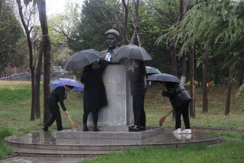 公司首届冯思广班员工代表怀着无比崇敬之情,认真擦拭烈士雕像,清扫周边杂物,以表深深哀思。